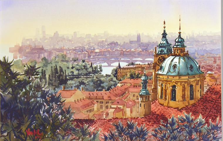 On a walk across the Vltava River from the main area of the city, up into the hillside area of the Little Quarter, new vistas appear at every turn. The church of St. Nicholas is in the foreground.