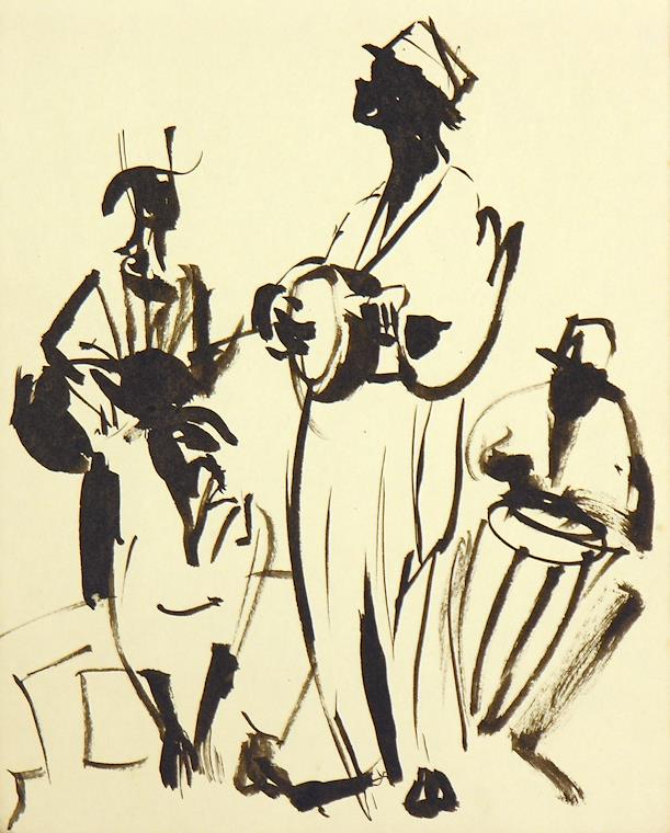 This is an ink sketch of musicians in Kingston, Jamaica playing a popular form of Caribbean music of 1964, the "Ska". I did these while on our honeymoon.