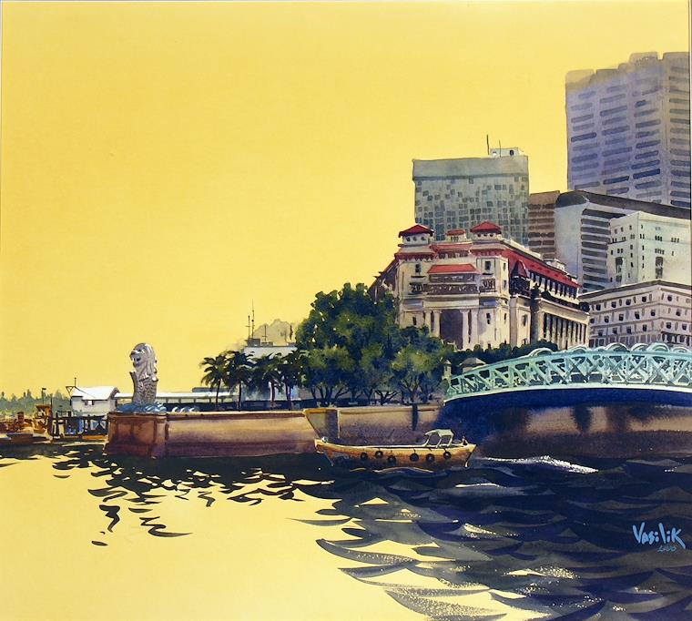 The lion is the symbol of Singapore. Shot late on a gray day, I spiced up the painting with a luminous yellow sky and reflections.