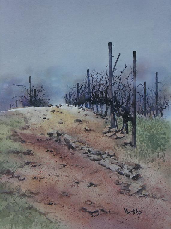 Winter Vines15 1/2" x 21 1/2" - $600 SOLDStellenbosch Wineries, South Africa. That late winter day was wet and misty as we made our way through the wine country.Painting Sponsor ($25): Mary Harper