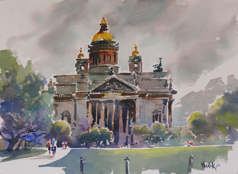 Cathedral of Saint Issac10 1/2" x 14" - $250St. Petersburg, Russia. A quick painting of a massive building before nightfall.