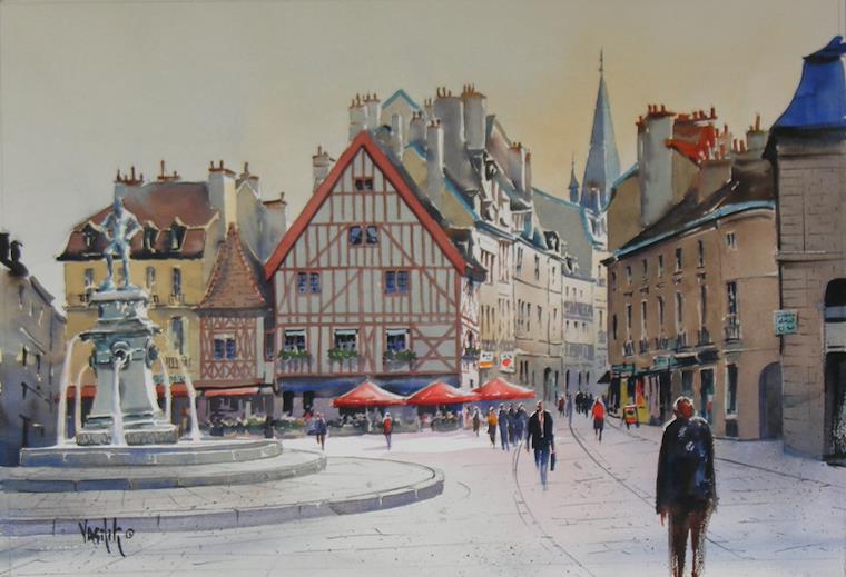 Early Morning in the Square17" x 25 1/2" - $1,400 SOLDMontbard, France. From our barge trip through the Burgundy region, we made day trips into these wonderful towns.