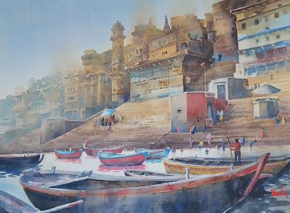 Three red boats on the Ganges 18" x 24" - $400 $200