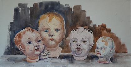 This bizarre collections of doll heads, 'I ain't got no body', waits repair at the Ventura Doll Hospital.