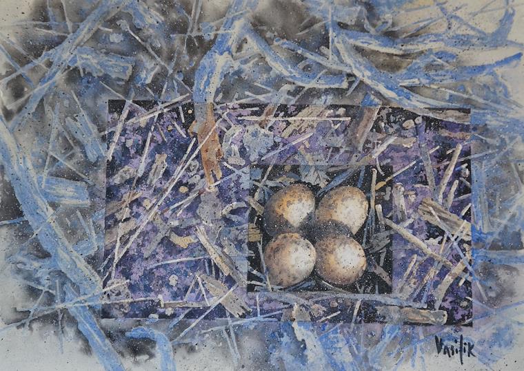 Nest at the Watering Hole16" x 21" - $200 $100 SOLDOur African safari took us into the savannah to a watering hole where this nest seemed to be in peril.
